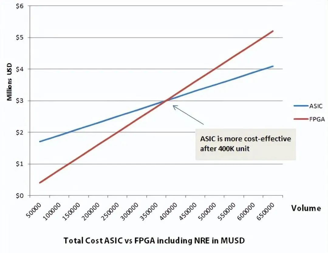 如下图所示,40W片,是ASIC和FPGA成本高低的一个分界线。产量少于40W,FPGA便宜。多于40W,ASIC便宜。