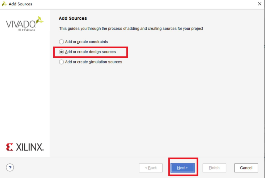 弹出的界面勾选Add or create design sources,表示添加或者新建一个设计文档,然后点击next:
