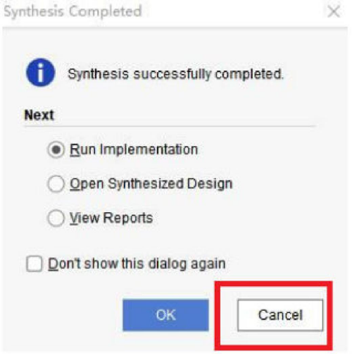 完成综合后,弹出的综合完成对话框中我们点击Cancel取消。不要进行Implementation。