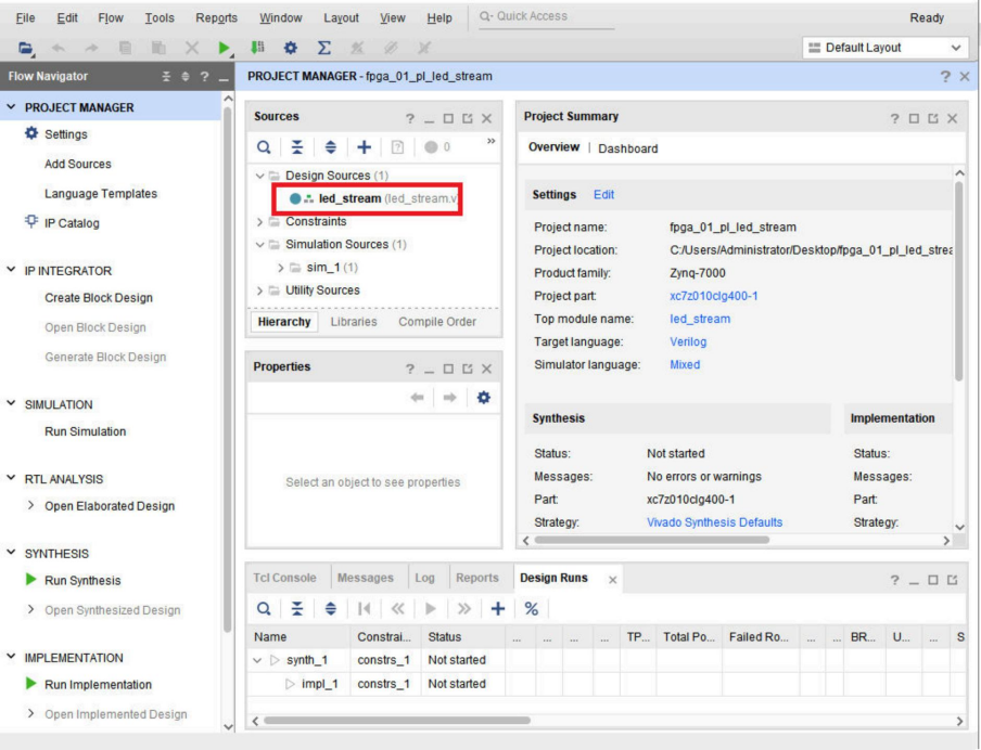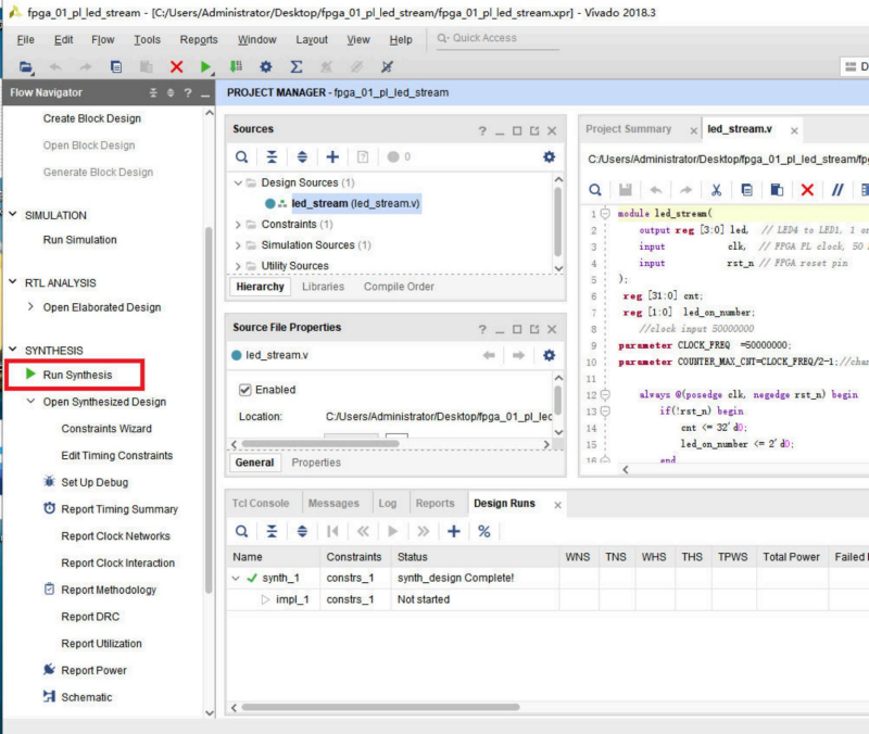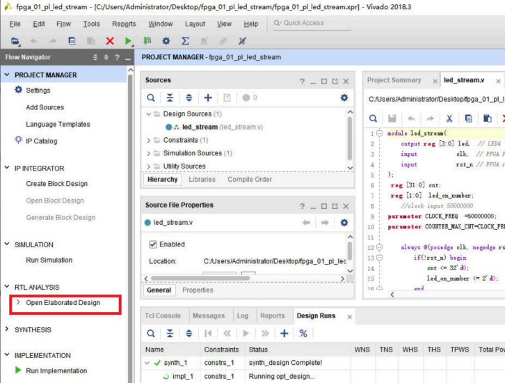 我们可以看到,led_stream模块和文档已经在设计文件层次窗口中。