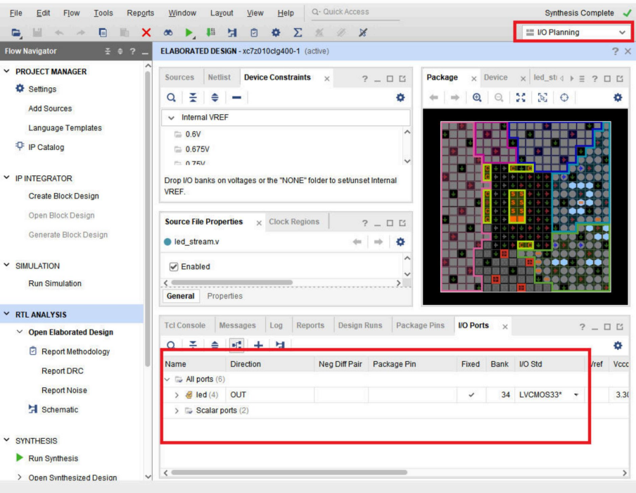 由于我们还没有进行管脚绑定,所以我们需要先绑定管脚在进行Implementation实现,最后布局布线最后生成BIT文件。我们接下来进行绑定管脚。我们点击工程管理栏的RTL ANALYSIS下面的>open Elaborated Design: