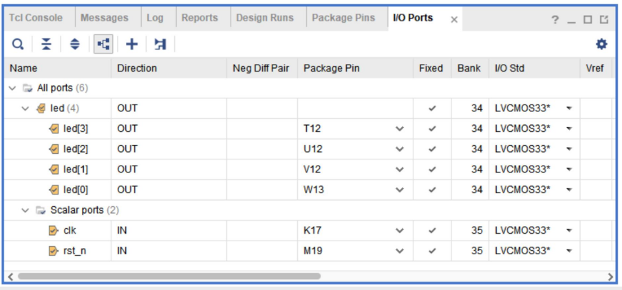选择I/OPlanning之后出现如下视图,在下面窗口部分,I/OPorts即可进行IO管脚绑定。根据原理图绑定的管脚如下所示,LED和时钟,按钮复位信号均为3.3V电平标准,LVCMOS33,关于引脚,大家可以查阅原理图和硬件手册,下图:复位使用我们板子的KEY3(FPGA_KEY2),引脚绑定如下图: