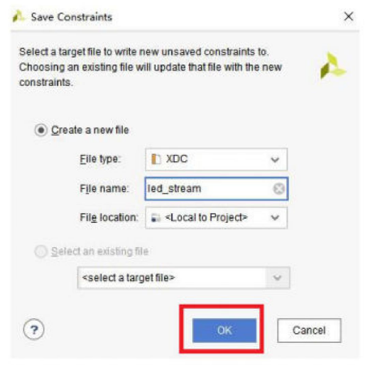 按下ctrl+s保存,弹出的保存对话框,填入管脚约束文件名。我们这里取为led_stream: