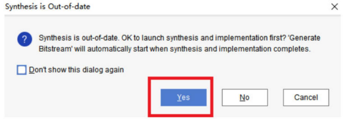 我们点击工程管理栏的PROGRAM AND DEBUG下面的Generate Bitestream生成BIT文件。(也可以先点击IMPLEMENTATION下面的Run implementation先进行实现,实现包括布局布线,这里直接省车bit文件包含了实现操作)。弹出的对话框为综合信息过期。这里默认点击OK(由于软件综合后才能有模块的顶层引脚信息,才能进行绑定管脚。我们绑定管脚之后,软件认为工程信息发生了变更所以需要再次综合)。