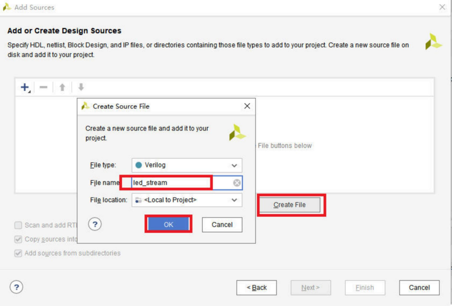 然后点击Create File,弹出的子对话框中,File Type默认是verilog,如果采用VHDL编写,则选择为VHDL。我们默认采用verilog。File Name填入verilog文件名,我们这里填入的是led_stream。然后点击OK。