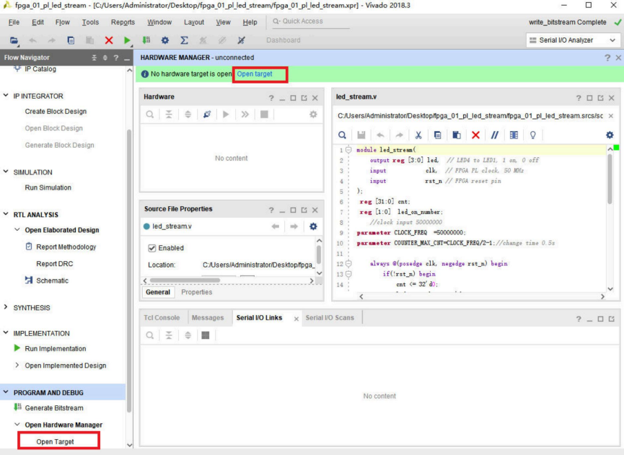 我们打开VIVADO硬件管理的方式也可以从左下角Open hardware manager打开。我们点击上方Opentarget: