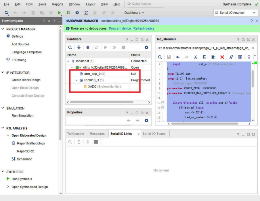 上一节步骤,弹出的硬件管理界面,这个时候可以插上我们的ZYNQ开发板的下载器USB接口(TYPE-C的JTAG口),开发板上电。