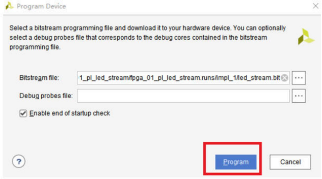 弹出的烧写对话框,默认都不改动,其中Bitstream file表示选择的bit文件,也就是上面我们生成的bit文件。点击program: