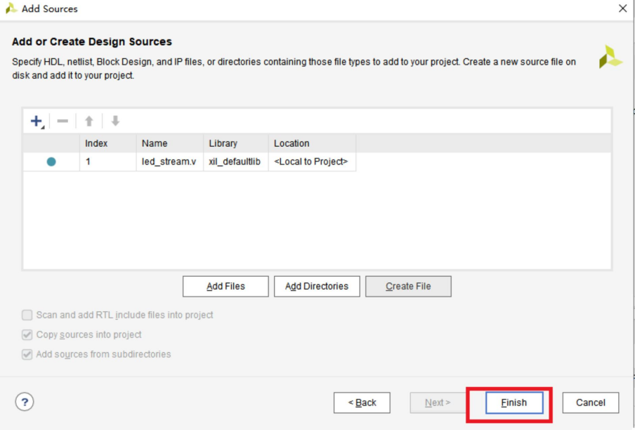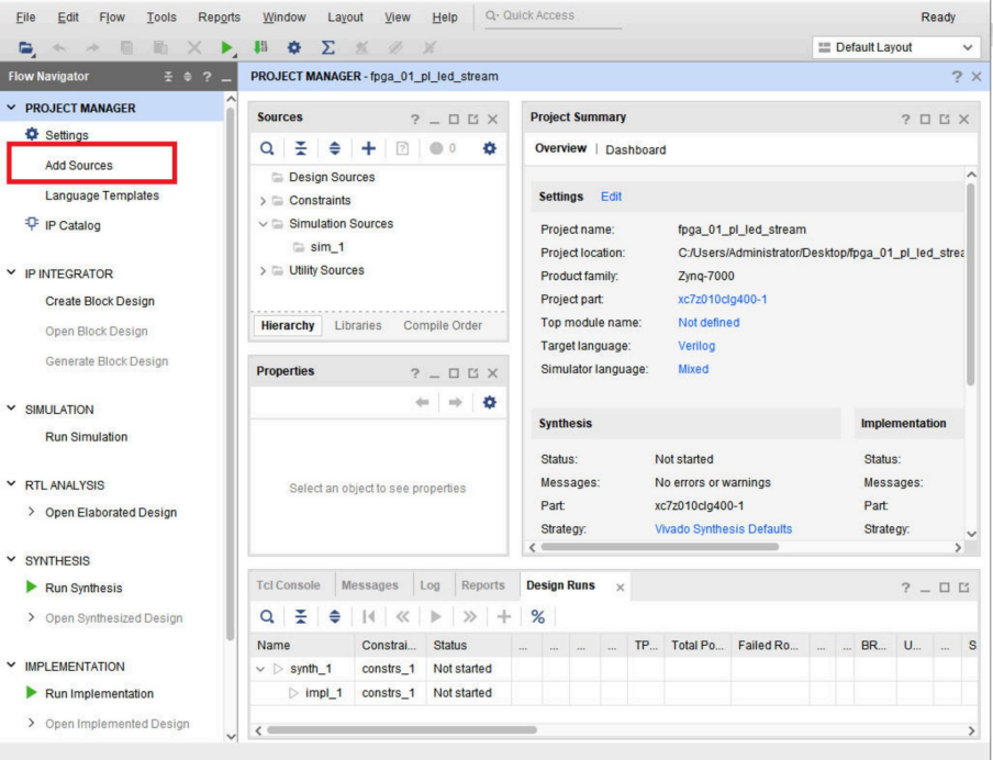 首先工程管理栏点击 Add Sources 添加我们需要编写设计的流水灯代码文件: