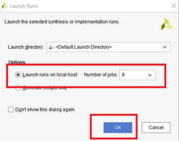 然后弹出的Launch Runs对话框根据电脑配置选择Jobs数量(代表综合消耗的进线程,VIVADO目前已验证过支持12线程,采用锐龙的R5-2600X处理器,因为它是6核12线程),由于这里电脑配置是I7-7700K,四核八线程,所以最多可以选择8个。综合过程很耗CPU性能,所以如果想要综合过程中流畅使用电脑,可以少选两个线程。选完线程数量,点击OK进行综合(综合过程很慢,请耐心等待):