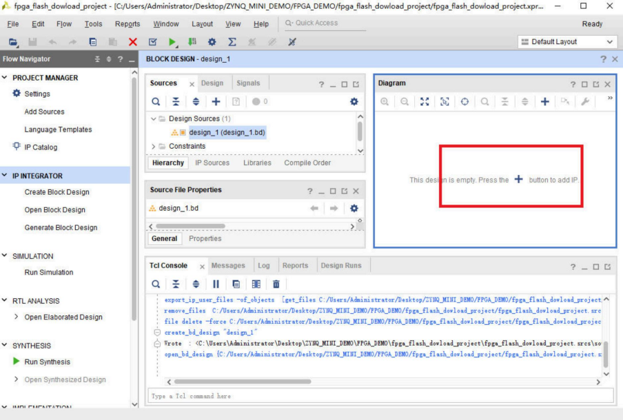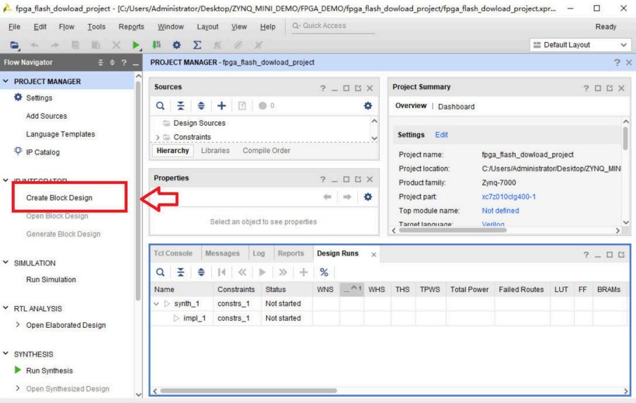 首先,我们在新建完成的fpga_03_fpga_flash_dowload工程,新建一个bd文件。我们在工程管 理栏的IP INTEGRATOR下的Create Block Design 点击创建bd文件。 Bd文件可对FPGA进行图表原理图方式进行开发,更加直观方便。