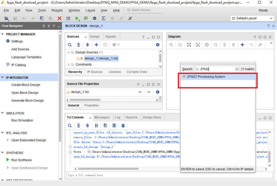 点击完+之后,弹出的IP核选项内,我们在Serach输入ZYNQ,即可看到我们需要用到的 ZYNQ片上系统: