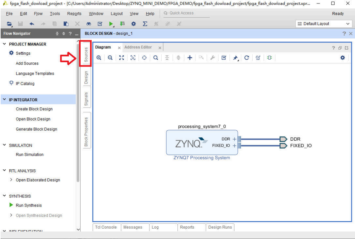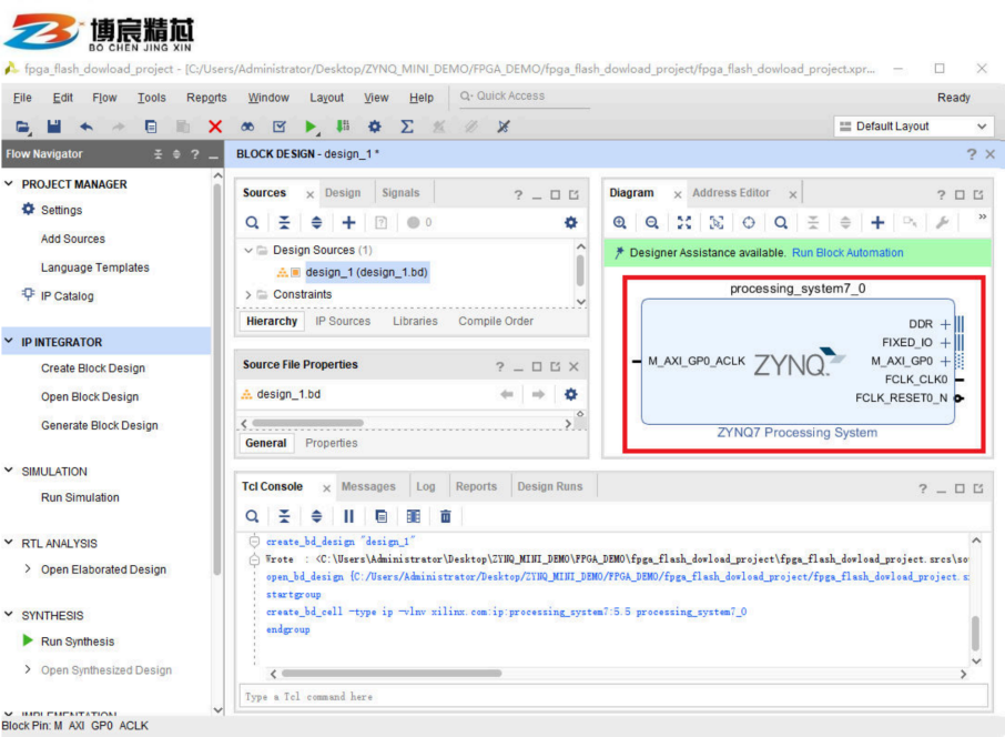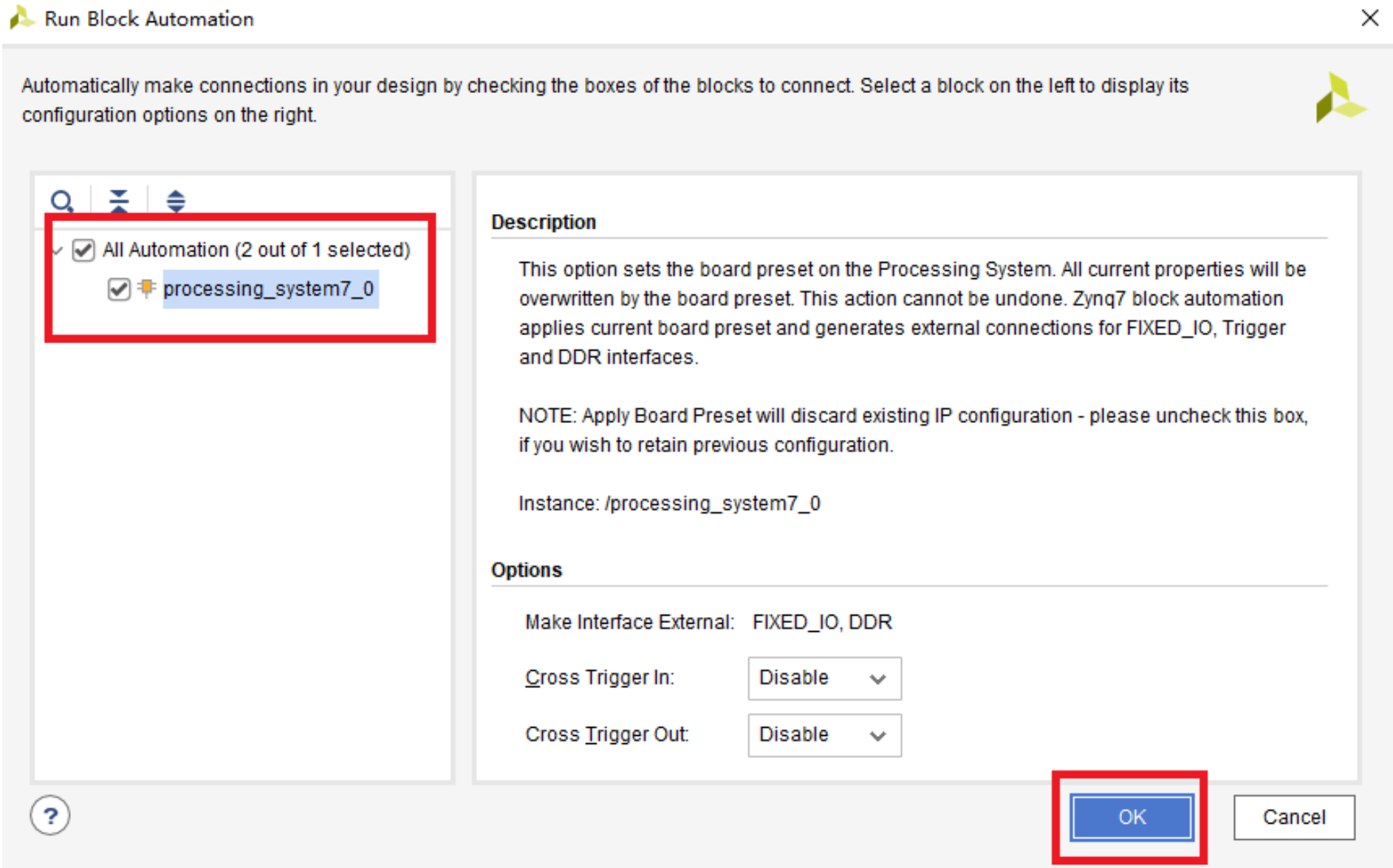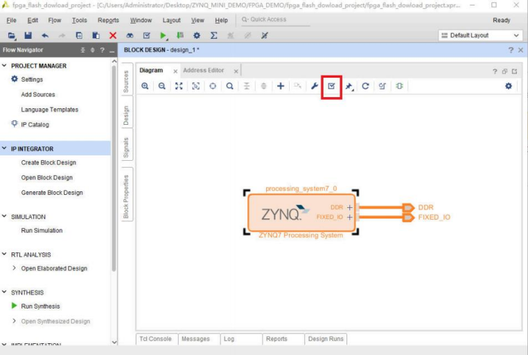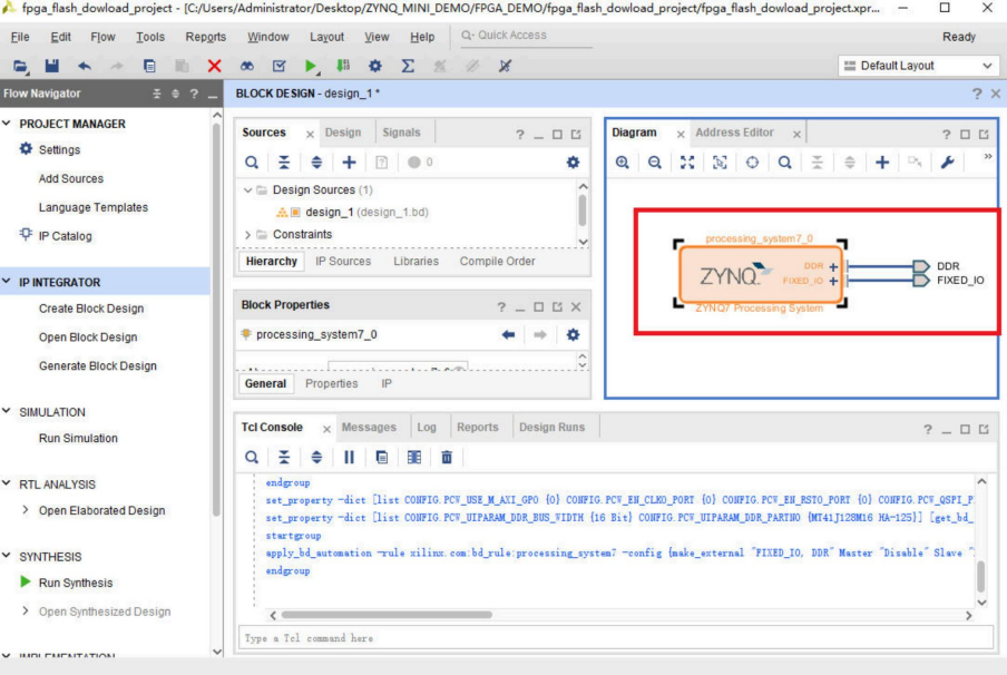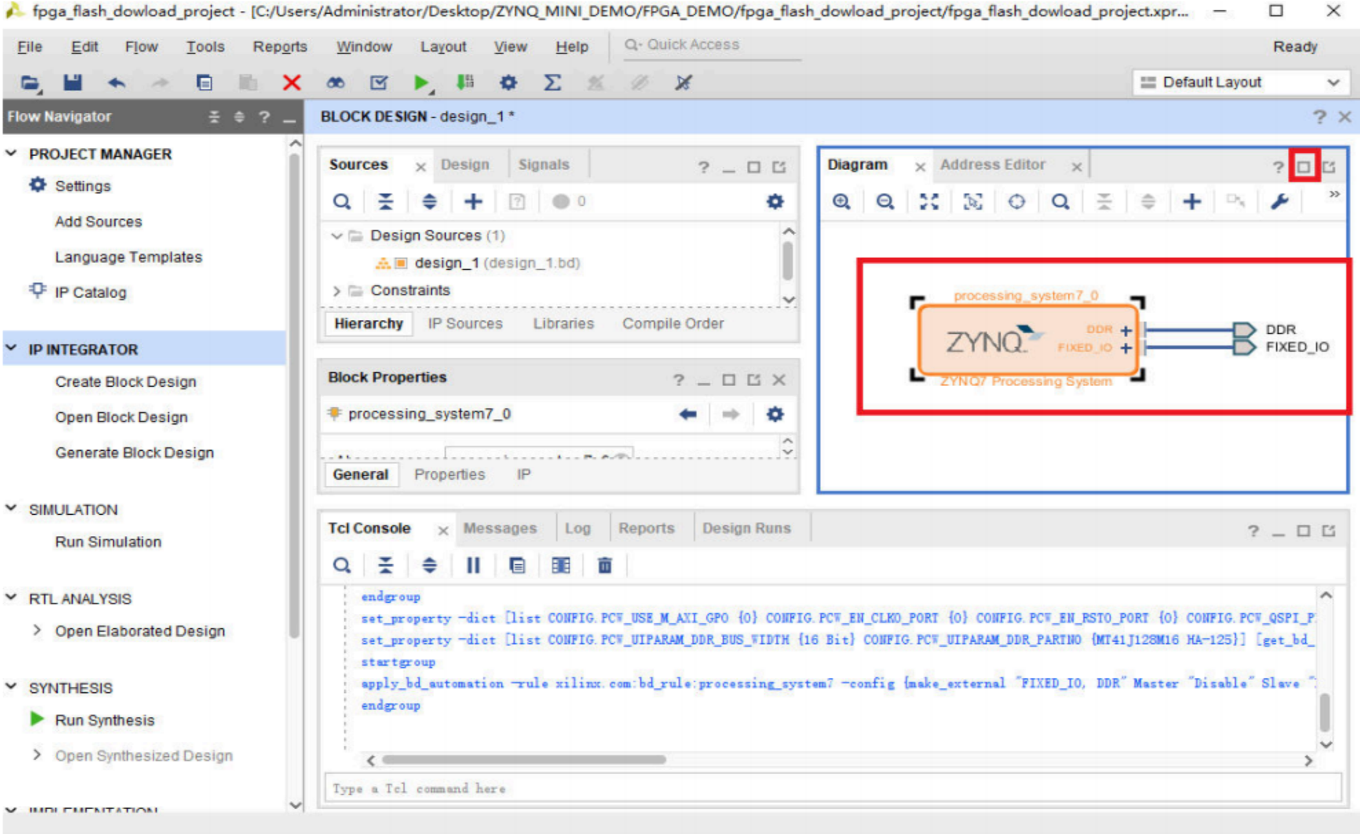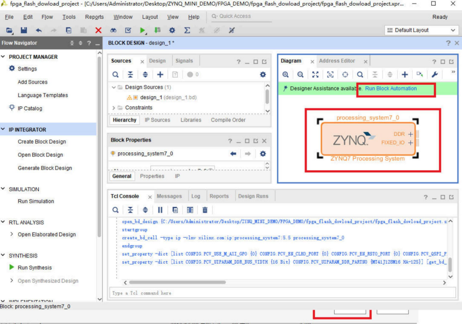 最后,我们点击OK退出IP配置。我们可以看到, Diagram内的ZYNQ接口少了很多,只剩下DDR和FIXED_IO。然后,我们点击途中Diagram文件筐最上面的蓝色字体 Run Block Automation: