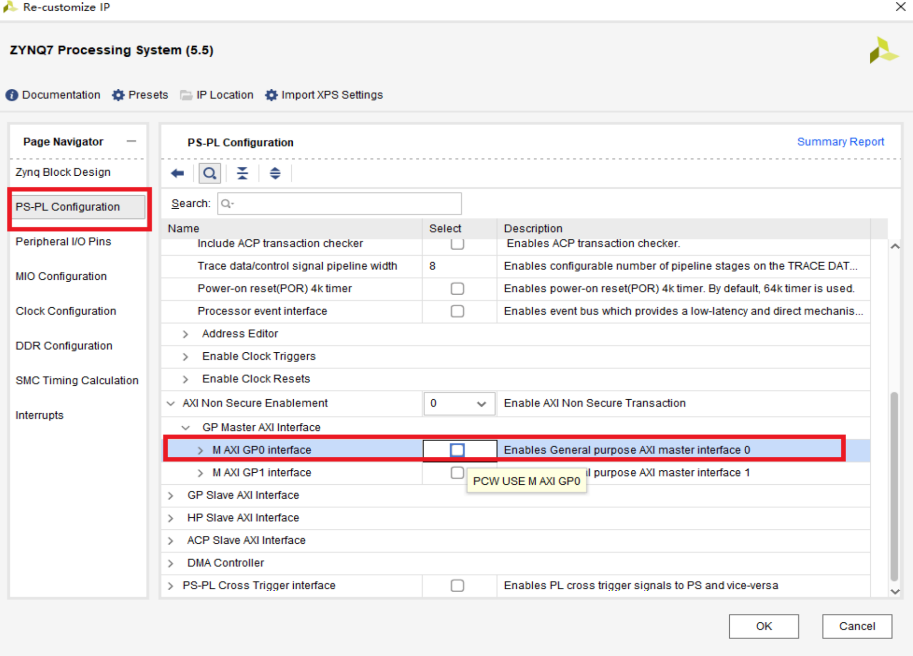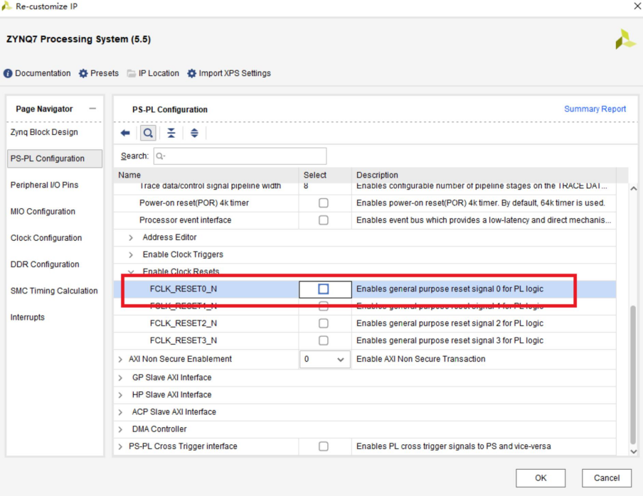 首先,PS-PL configration的general,下拉找到enable clock resets,展开,将第一个勾选掉,并且AXI Non Secure Enablement下的GP Master AXI Interface的M AXI GP0 interface勾掉:
