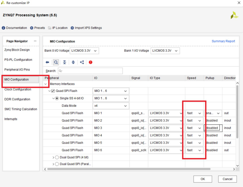 MIO Configuration ,展开Memory interfaces->Quad SPI Flash->Signle SS 4-bit IO,将speed改成fast: