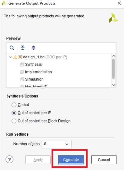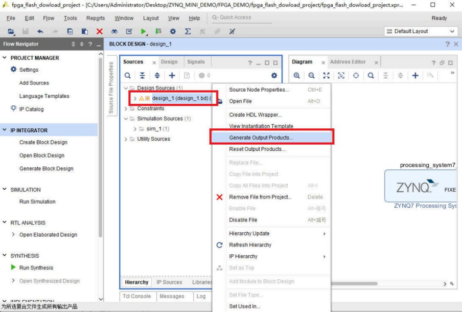 然后在bd文件右键Generate Output Products生成输出相关文件。输出文件包括 ZYNQ的IP生成的硬件描述语言。