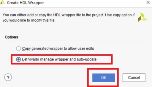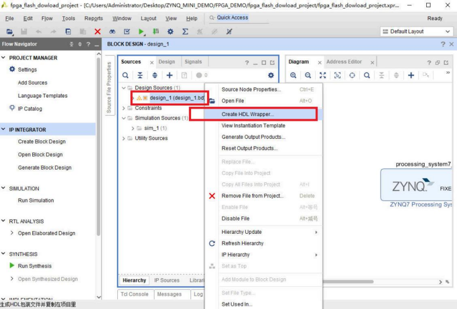 我们再次回到文件管理器,在bd文件右键,点击Create HDL Wrapper,生成顶层接 口的HDL文件,这个文件是我们的顶层模块HDL文件。
