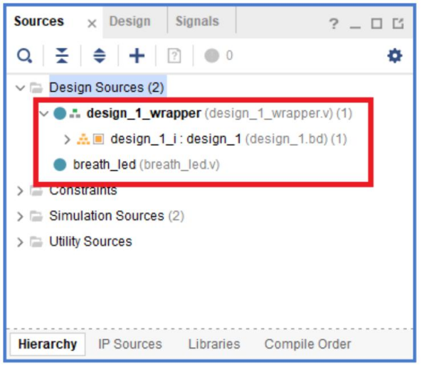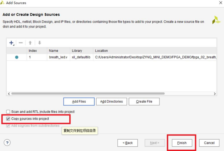 由于在ZYNQ处理器调用是直接调用模块,我们还需要在工程中自动生成的HDL顶层文件 中例化我们的FPGA代码。我们将fpga_02_breath_led例程中的breath_led.v添加到工程中。 我们在Sources栏的Design Sources右键Add Sources添加我们的breath_led.v文件。添加的 时候,可以选择拷贝到工程中: