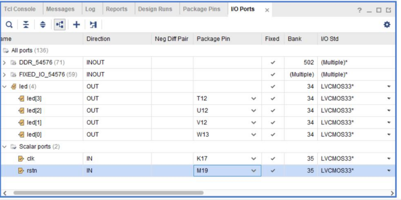综合第一遍之后,接着需要绑定管脚。绑定管脚在工程管理栏RTL ANALYSIS下面的Open elaborated design,进去之后切换视图为I/O planing .绑定管脚约束详细操作请参考 01 _fpga开发之led流水灯教程。管脚也保持一致,电平标准均为LVCMOS3.3。我们只需要约 束例化进来的breath_led.v的信号对外接口,其余信号,关于zynq的接口我们都不用管。
