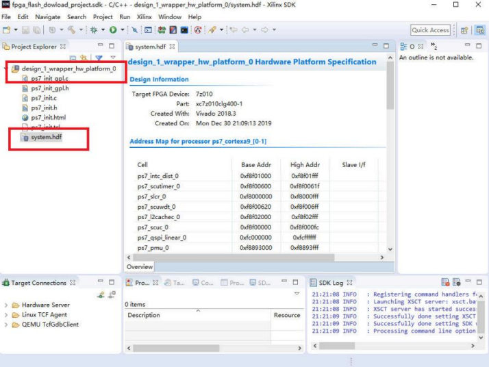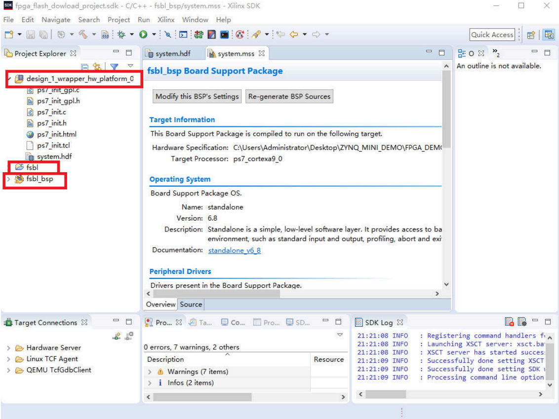 最后,我们可以看到SDK左边工程目录出现了三个工程,分别是硬件描述工程,fsbl启动引导 代码工程,和fsbl的板级支持包工程。