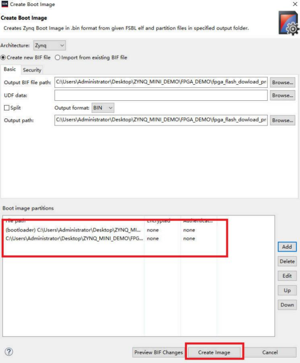 一般情况下,制作启动的BIN文件,都是先添加fsbl.elf文件( bootloader) ,然后添加 bit文件( datafile) ,如果有软件arm的代码app应用程序 ,再添加一个app.elf( datafile)。 本工程只有FPGA开发的FLASH固化,没有应用程序,所以只需要这两个文件。可以看到列表 里面有两个文件然后点击Create Image: