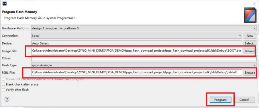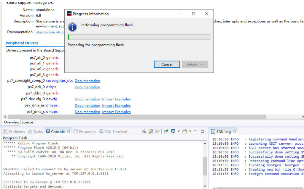 Image 文件即刚才我们生成的BIN文件,FSBL即刚才选的FSBL.elf。然后等待FLASH操作完成。