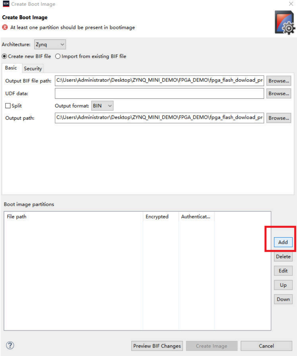 我们点击SDK上方的工具栏中的XILINX->Create Boot Image,我们开始制作ZYNQ启 动的BIN文件(其中制作好的BIN文件包含我们的FPGA所需要固化的BIT文件)
