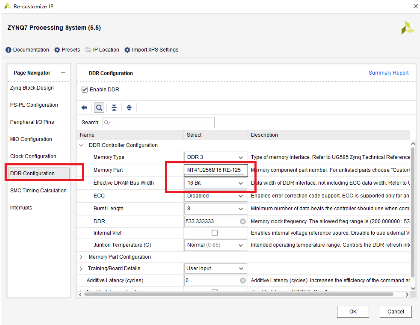 最后我们配置DDR3内存控制器,型号我们选择MT41J256M16 HA-125 ,位宽16位, 一定要检查位宽是16!如果是32无法运行,我们物理DDR3是16位: