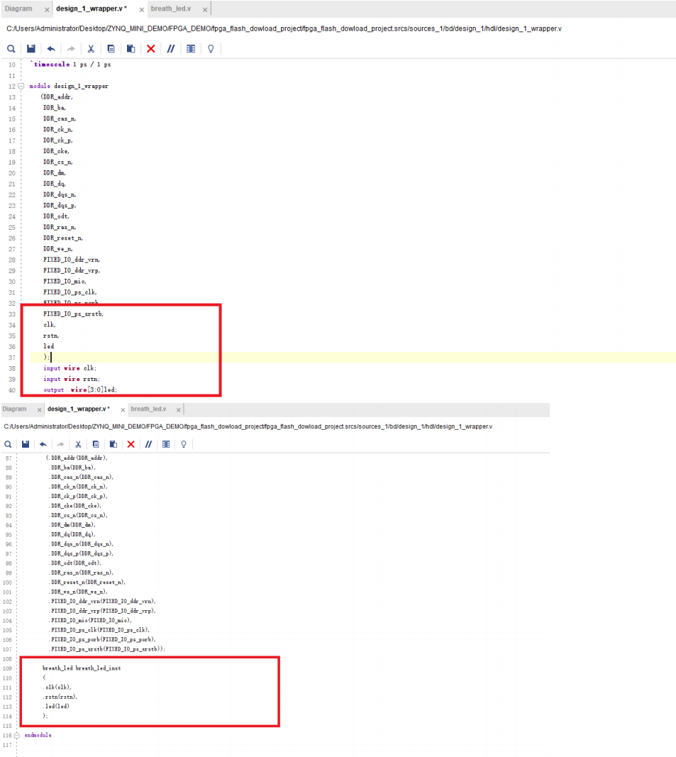 我么将breath_led.v里面的模块例化到design_1 _wrapper。首先,顶层信号接口添加 breath_led的三个信号,clk,rstn,led,然后在添加信号的类型声明。最后,在模块最后添加 breath_led模块的例化: