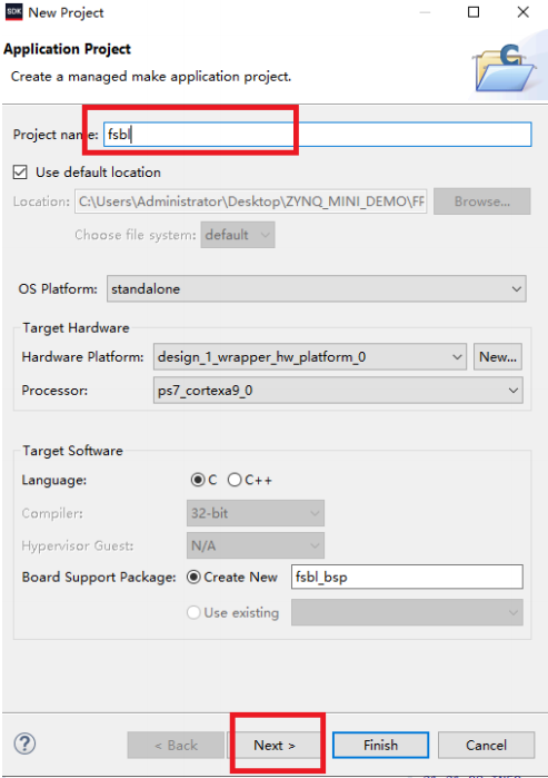 弹出的界面,我们填入工程名为fsbl,然后默认其他不改动,点击NEXT: