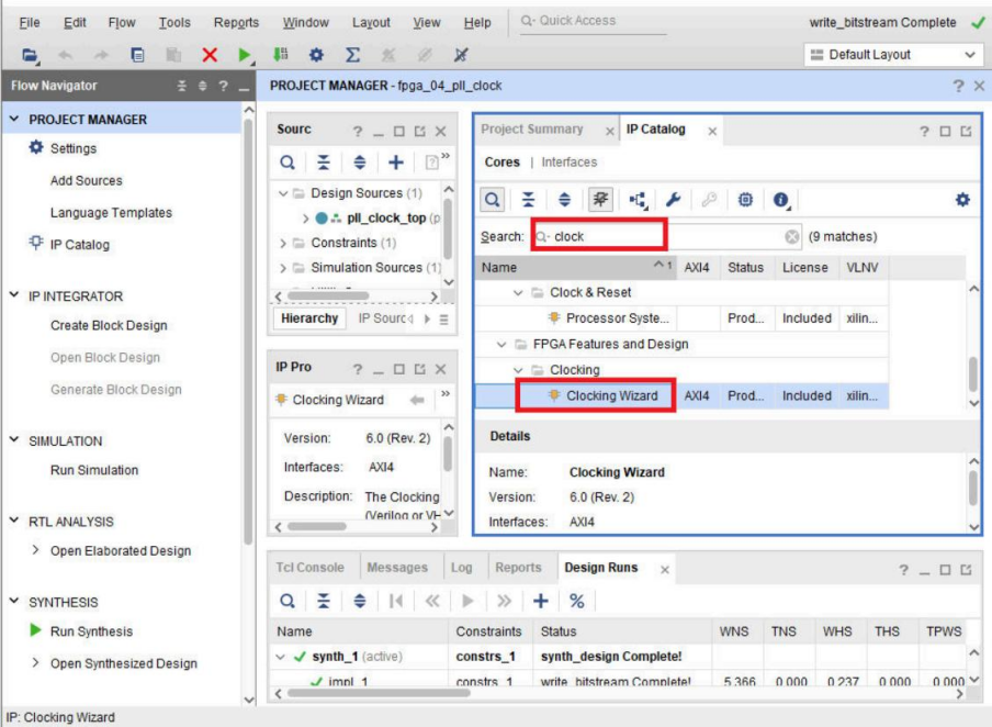 调用IP核 。我们调整下窗口布局,并且将新弹出的IP Catalog窗口最大化。读者在 使用VIVADO的时候,多多熟悉一下软件界面,很多时候界面布局和工具栏,功能导航界面 都跟传统的有些区别,在使用的时候多多摸索,多多熟悉,毕竟软件很强大,使用上也有些 新颖之处,多多使用就好。我们在IP Catalog输入clock,下拉界面找到clocking wizard并 且双击,打开IP配置界面:
