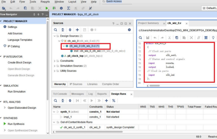 Sources下的Design Sources的IP核下出现了一个时钟模块的顶层.v文件。我们双击打 开他,可以看到模块的名称和接口信号。我们将这个时钟模块例化到pll_clock_top.v里面。