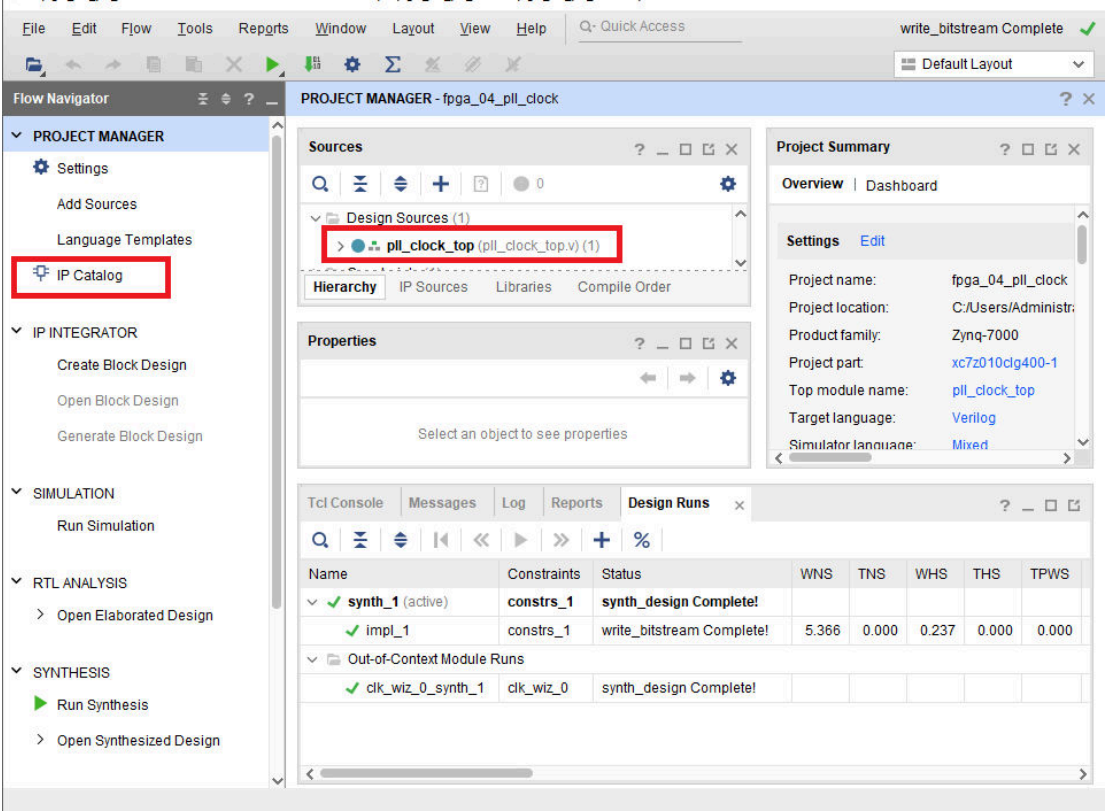 工程管理栏点击 Add Sources 添加新建文件:pll_clock_top.v,模块名pll_clock_top,添加新建完成 之后点击工程管理栏的PROJECT MANAGER下的IP Catalog: