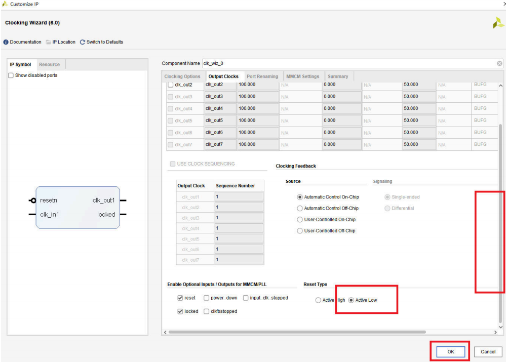 右边下拉界面,最下面设置reset信号为低有效,最后点击OK完成配置: