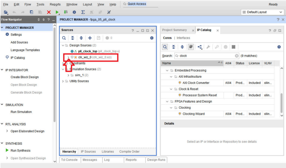 我们回到Sources界面,可以看到, Design Sources出现了clk_wiz_0的IP核添加进来了。点 击左边IP核的箭头,打开IP的架构。