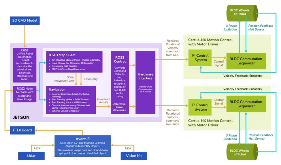 AMR的架构采用分层模块化设计,旨在实现可靠性、可扩展性和低功耗。其中,Jetson平台负责运行ROS2算法,而莱迪思FPGA则承担运动控制任务。