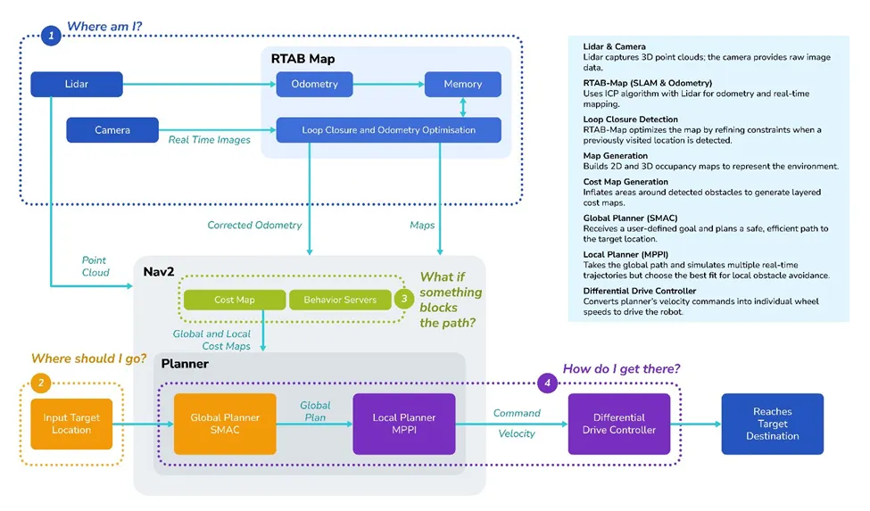 ▶ 导航系统:导航模块通过对障碍物周围区域进行“膨胀”处理生成代价地图,这些代价梯度引导规划器生成低风险路径。SMAC负责长距离路径规划,而MPPI则评估多个轨迹选项并选择最安全路径。