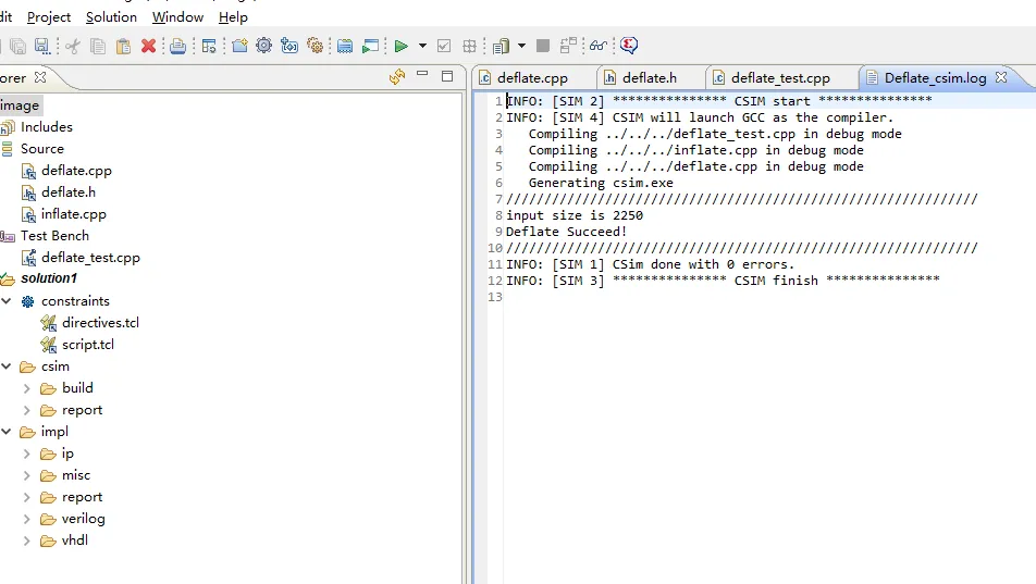 图10,图11中,hls正常进行仿真,首先通过压缩算法对txt文件或字符串进行压缩,接着进行解压操作,将解压后的代码与源代码进行比较,如果结果一致,则能够验证压缩算法本身功能的准确性。