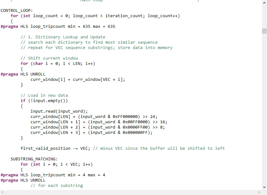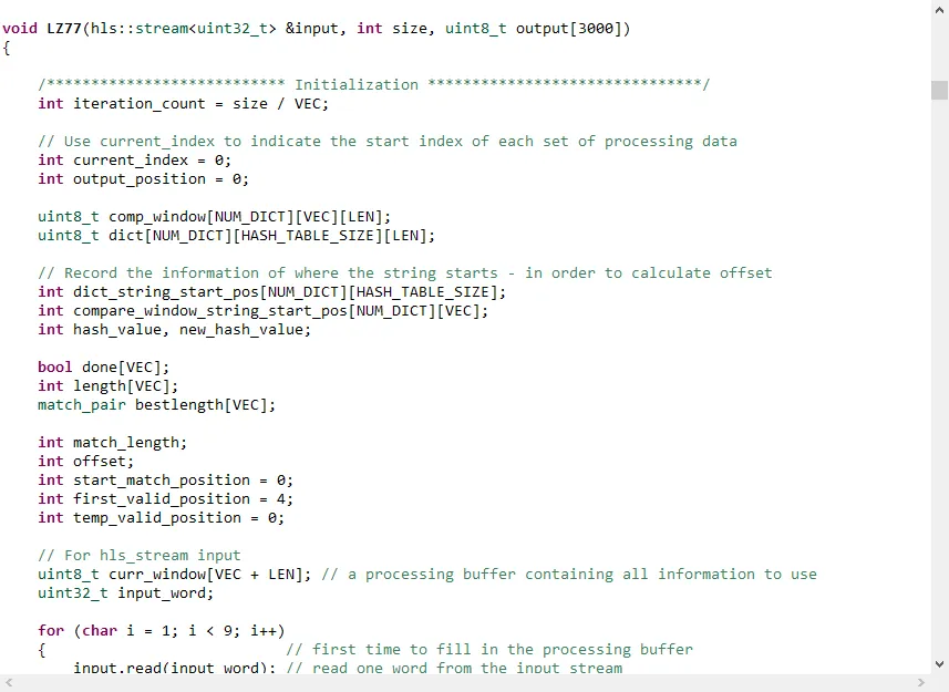 在图12,图13中,我们展示了部分压缩算法代码及优化指令,整体设计的源代码为github上的开源代码,在优化后我们外部的接口采用hls::stream的形式,内部使用到了pipeline,unroll等。