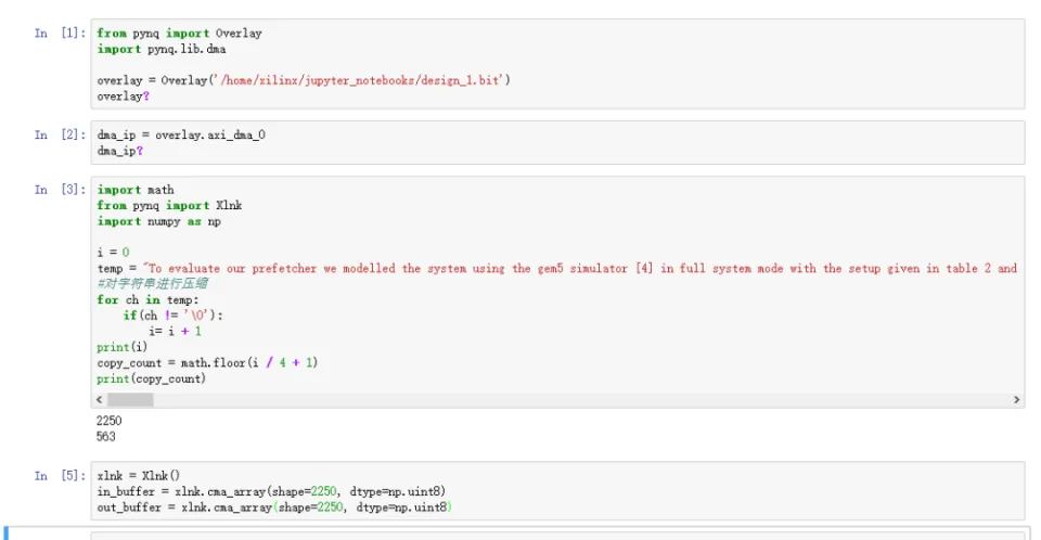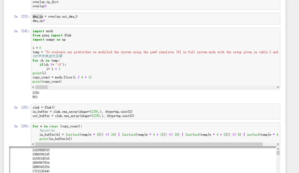 整体功能已经实现,能够在pynq z2上通过gzip压缩方式对txt文件或大段字符串进行压缩。具体展示如图1,左侧是在hls仿真是产生的结果,右侧是通过jupyter notebook在pynq z2上进行调试的结果,两者是一致的,压缩功能能够正常运行。图2是jupyter notebook上部分python代码。