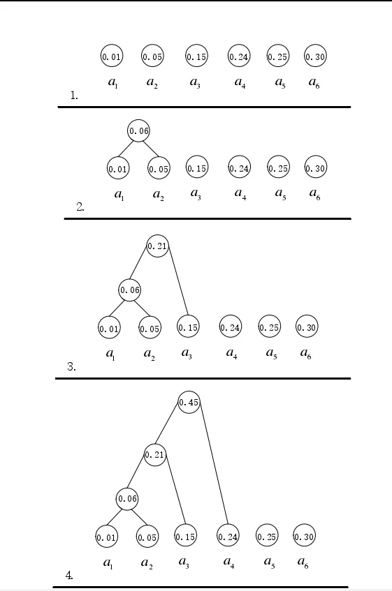步骤 4:重复步骤 3,直到所有信源符号的所在子树均被加入到同一树中;