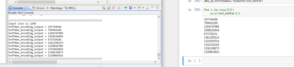 整体功能已经实现。并具备一定的加速效果,相比纯arm进行压缩速度提高了1.6倍。Vivado硬件工程能够通过综合、应用、生成比特流。最后通过Jupyter Notebook在pynq z2平台上进行功能验证。具体展示如图9,左侧是在hls仿真是产生的结果,右侧是通过jupyter notebook在pynq z2上进行调试的结果,两者是一致的,压缩功能能够正常运行。