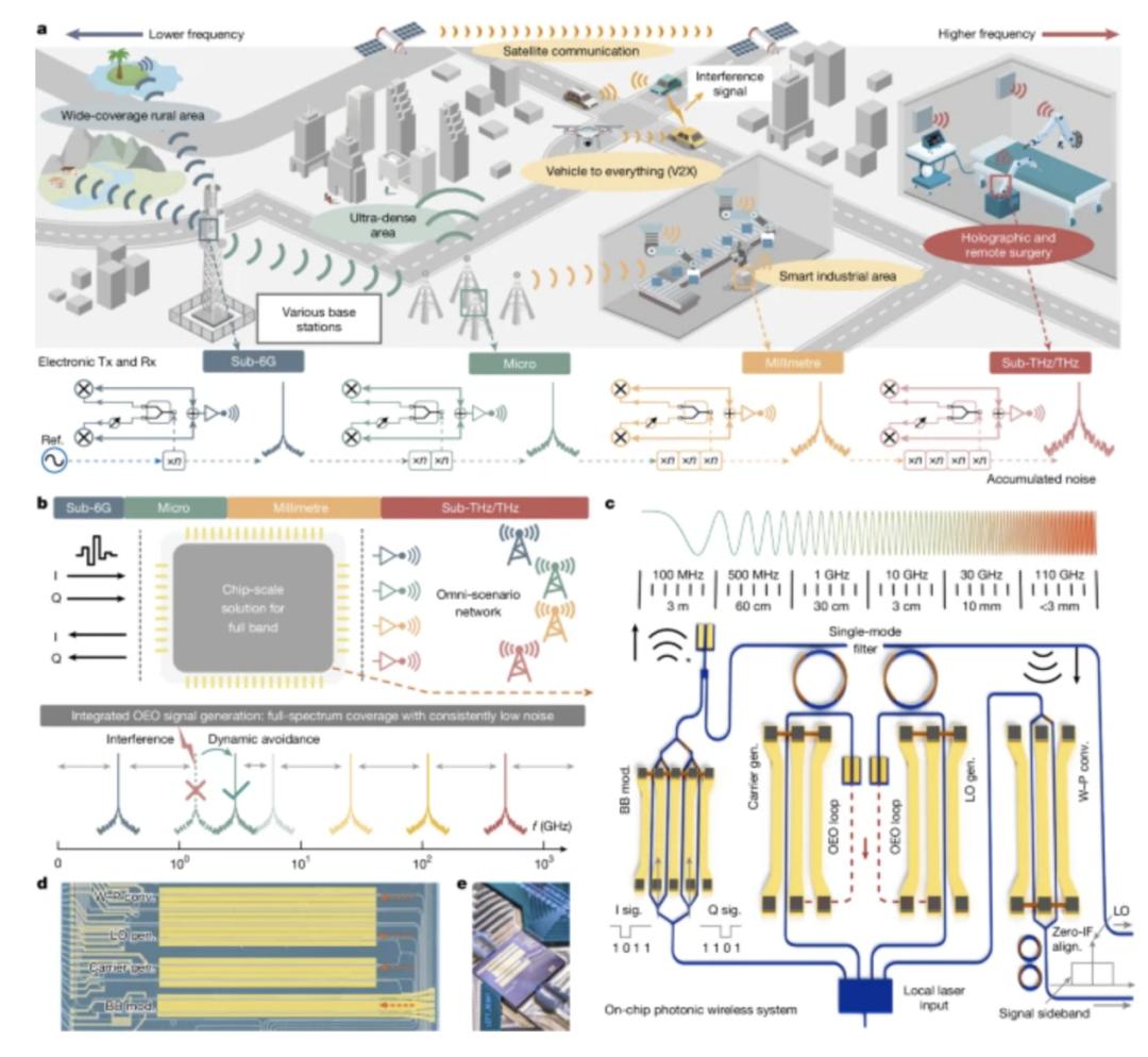 a、预测的全场景无线网络,其频率跨度很大,从 6 GHz 以下低频(深绿色)到亚太赫兹高频(红色)频段。传统的电气方案需要为每个频段配备不同的设备组,而基于乘法器的高频源会累积噪声。