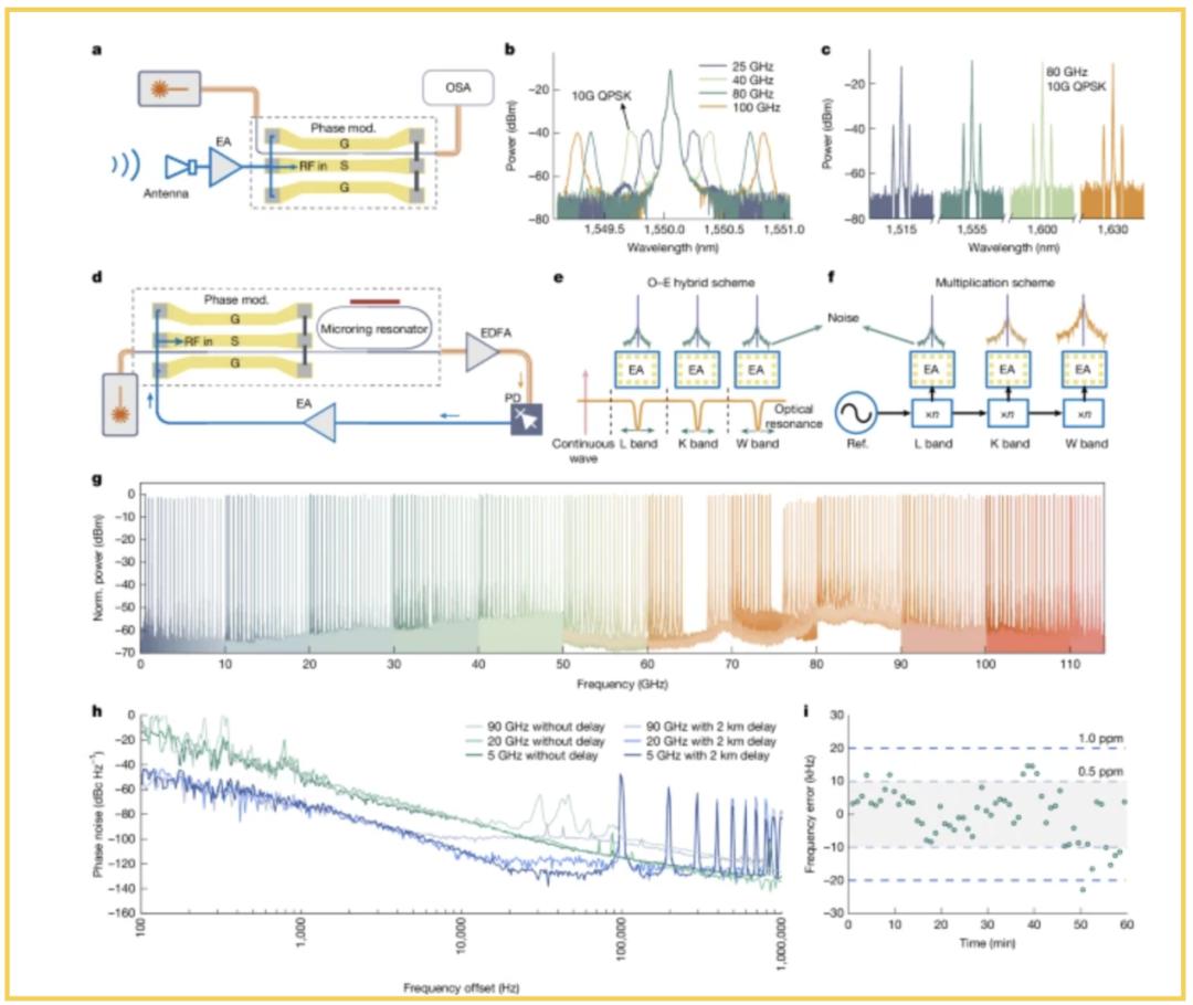 h、在不同频率下测得的 OEO 信号的相位噪声显示跨频段的性能一致。