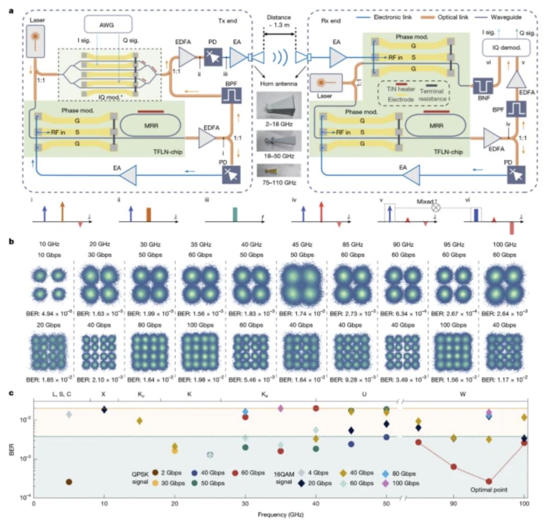 为了验证这些优势,我们在 5 GHz 至 100 GHz 的载波频率上以 5 GHz 为间隔进行全频谱无线通信,使用喇叭天线发送和接收高速无线信号。使用三组天线覆盖特定频段:2–18 GHz、18–50 GHz 和 75–110 GHz。50–75 GHz 频段未启用是由于其使用受限,因为在此范围内大气吸收率很高。图3b显示了不同频率信道中的代表性星座图,具有不同的数据速率和调制格式,即 QPSK 和 16 正交幅度调制 (16-QAM)。在 35 GHz 和 95 GHz 中心频率下均可实现高达 100 Gbps 的单通道传输(95 GHz 时的误码率 (BER) 甚至更低),这代表了集成光子辅助无线通信的最高数据速率。