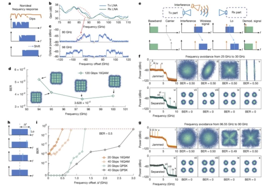 f 、g 、在初始频率为 25 GHz( f)和 96.55 GHz( g )时,在干扰(插图 i-v)和分离(插图 vi-x)信号情况下的基带功率谱和解调星座图。插图 (i) 和 (vi) 显示了各种情况下目标信号和干扰信号的功率谱密度。插图 (ii-v 和 vii-x) 显示了解调星座图和 BER。