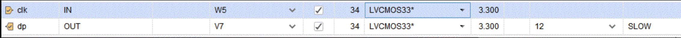 clk (LVCMOS18, requiring VCCO=1.800) and a_to_g[0] (LVCMOS33, requiring VCCO=3.300)