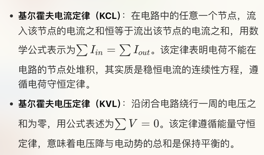 基尔霍夫定理是电路分析中最基础且不可或缺的定律,包括基尔霍夫电流定律(KCL)和基尔霍夫电压定律(KVL)。具体内容如下: