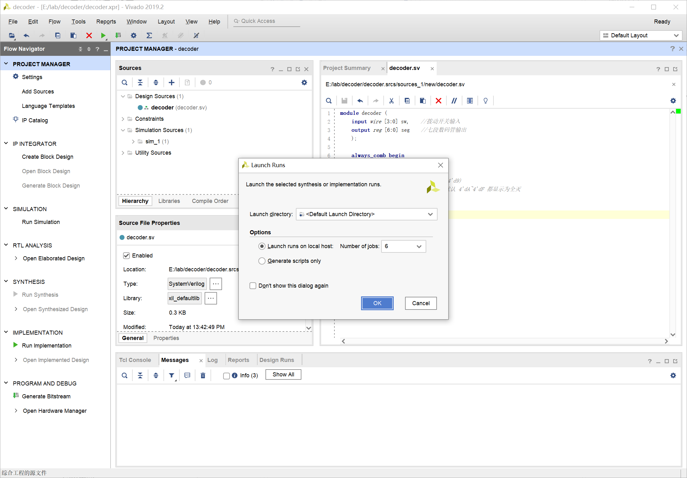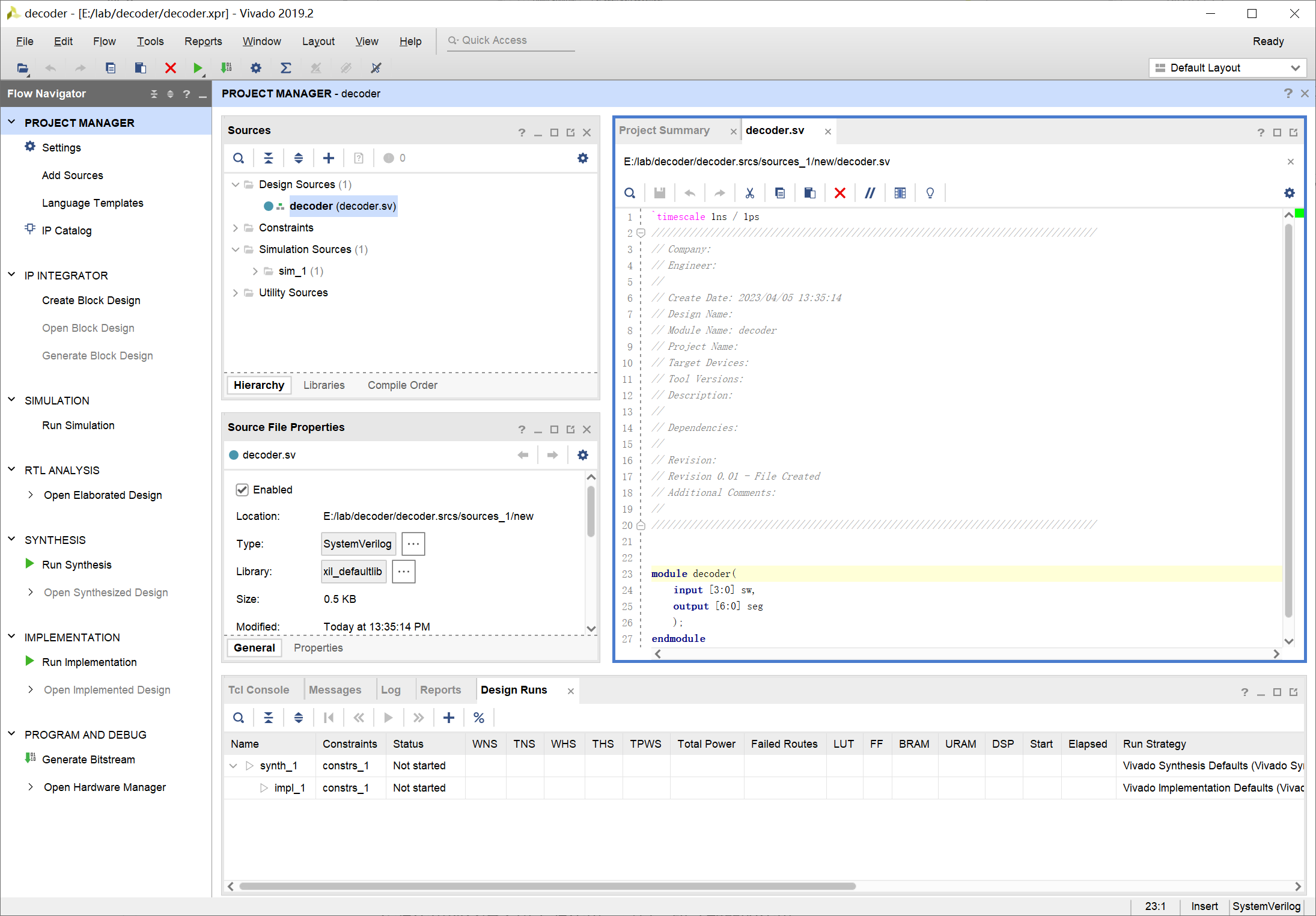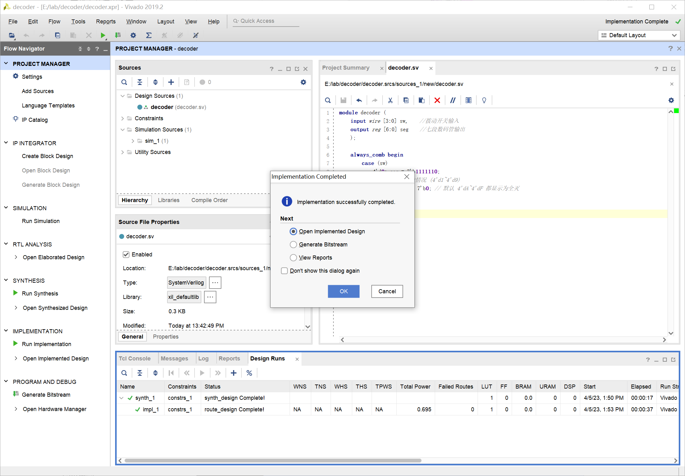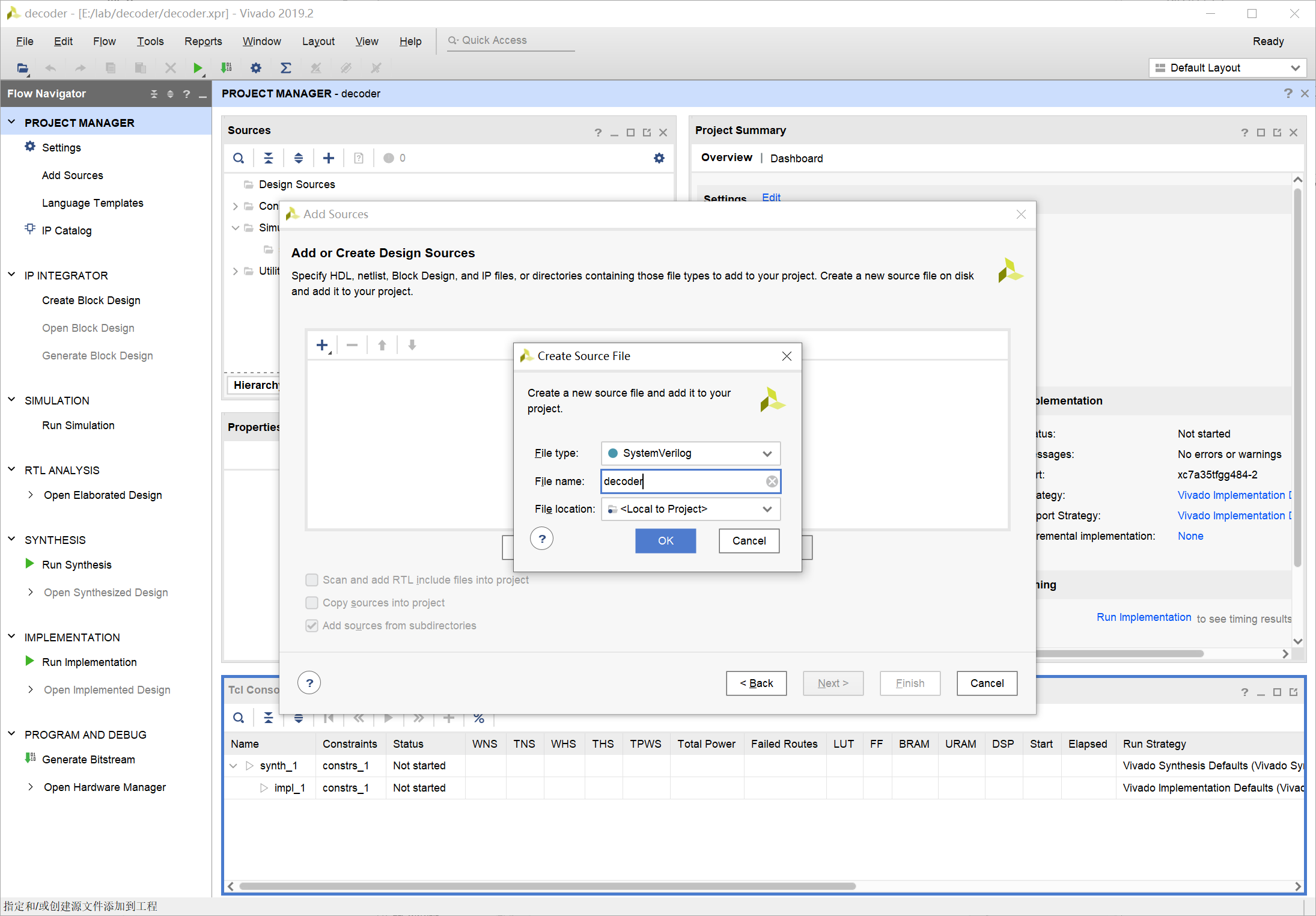 输入 decoder 为创建文件的名称,注意文件类型选择为 SystemVerilog:
