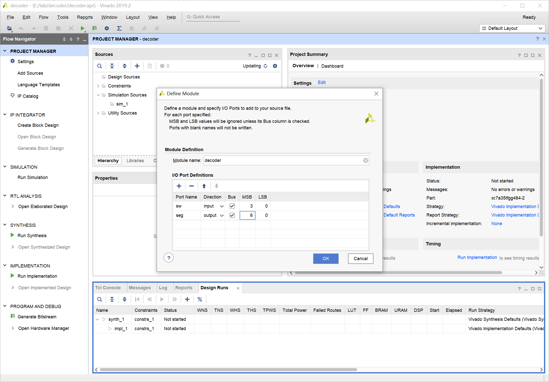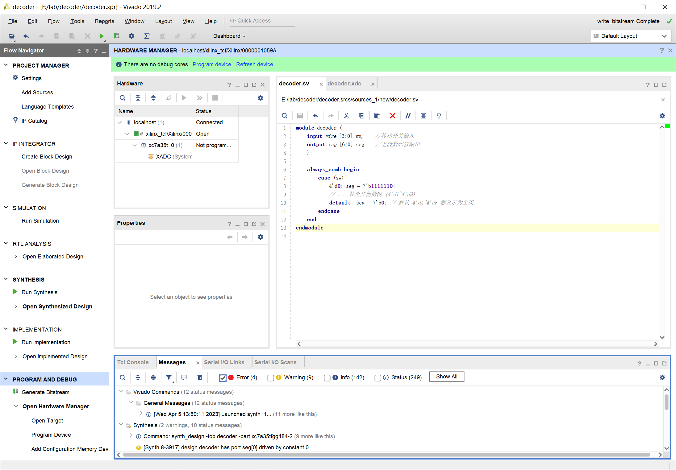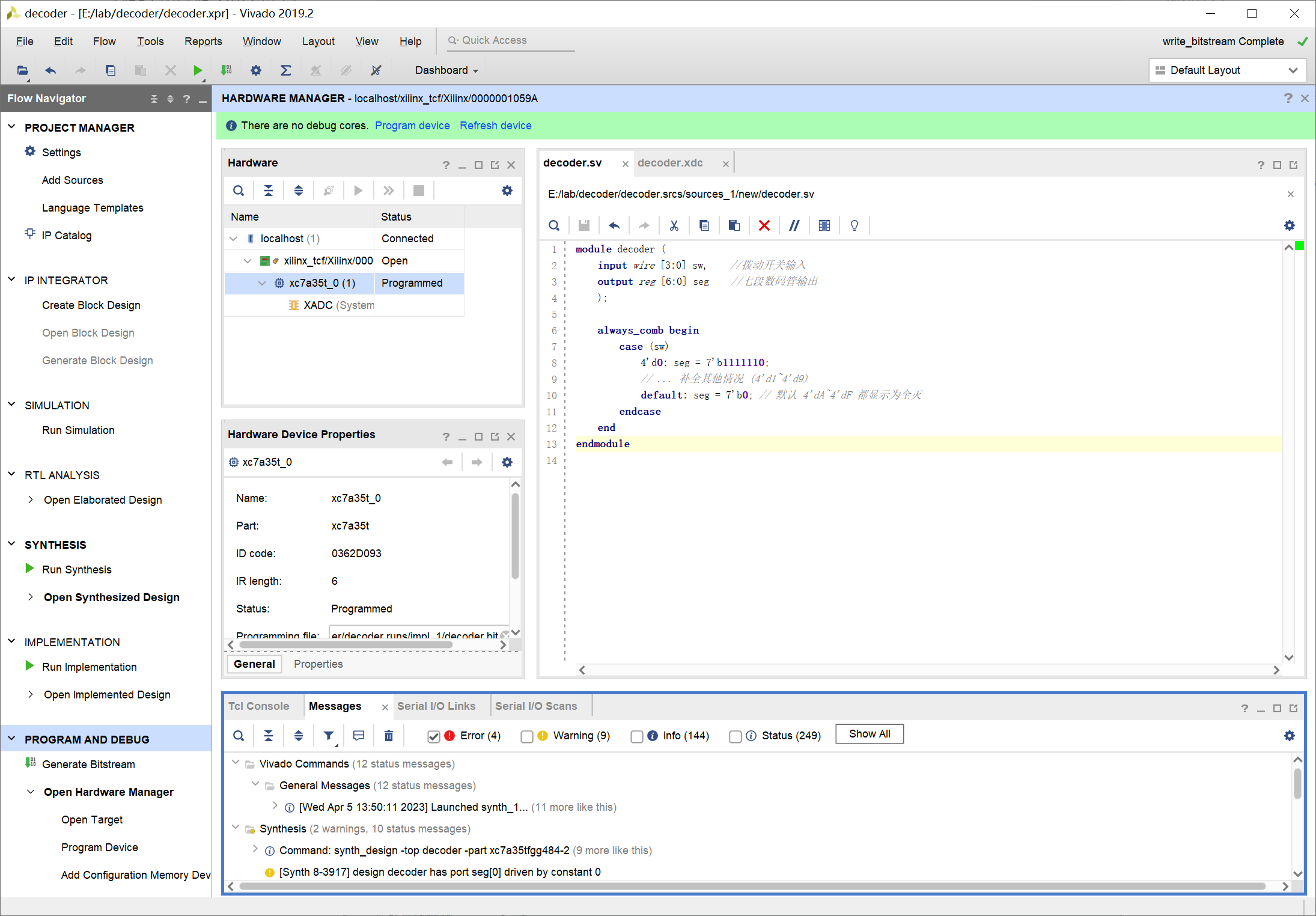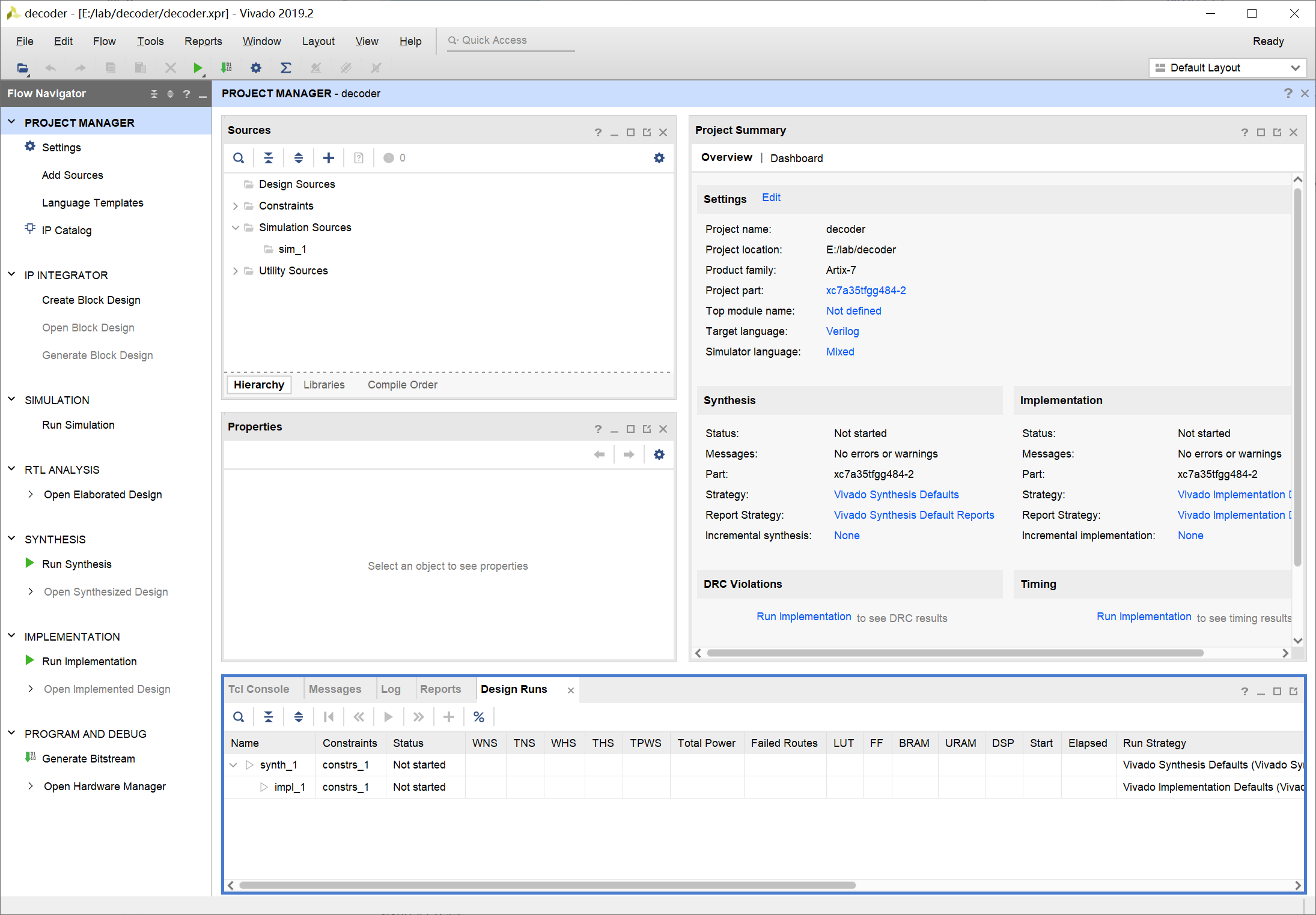 Hardware 框中就可以看到芯片的信息 xc7a35t_0,此时芯片的状态为 Not programmed: